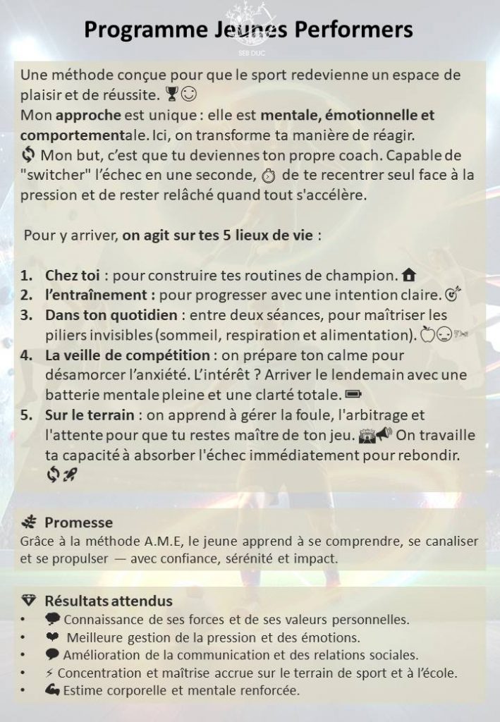 Accompagner les jeunes à développer une confiance solide, une estime de soi équilibrée et une stabilité émotionnelle pour améliorer leur performance sportive, scolaire et personnelle.